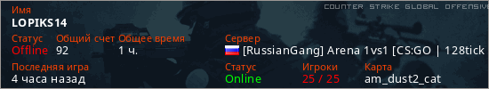 Играет на Counter Strike Global Offensive сервере. Страна: РоссияПервый раз замечен 14:19 09.01.2026