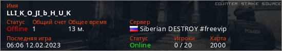 Играет на Counter Strike Source сервере. Страна: РоссияПервый раз замечен 05:56 12.02.2023