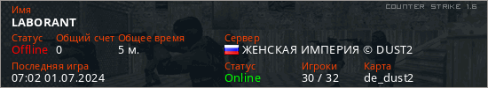 Играет на Counter Strike 1.6 сервере. Страна: РоссияПервый раз замечен 06:57 01.07.2024