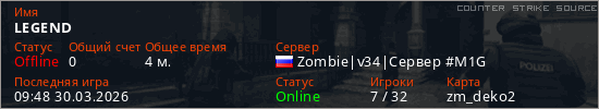 Играет на Counter Strike Source сервере. Страна: РоссияПервый раз замечен 09:46 30.03.2026