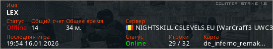Последний раз был в сети 19:54 16.01.2026 Игрок с таким ником замечен на 23 серверах