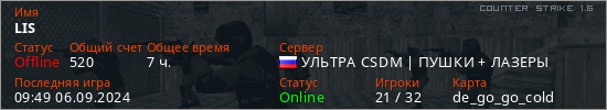 Играет на Counter Strike 1.6 сервере. Страна: РоссияПервый раз замечен 15:15 22.03.2024