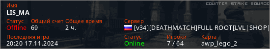 Играет на Counter Strike Source сервере. Страна: РоссияПервый раз замечен 15:16 16.08.2023