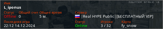Играет на Counter Strike 1.6 сервере. Страна: РоссияПервый раз замечен 22:06 14.12.2024