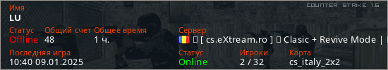 Играет на Counter Strike 1.6 сервере. Страна: РумынияПервый раз замечен 06:39 07.01.2025