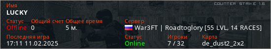 Играет на Counter Strike 1.6 сервере. Страна: РоссияПервый раз замечен 17:09 11.02.2025