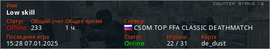 Играет на Counter Strike 1.6 сервере. Страна: РоссияПервый раз замечен 19:58 14.09.2021