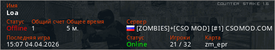 Играет на Counter Strike 1.6 сервере. Страна: РоссияПервый раз замечен 15:05 04.04.2026