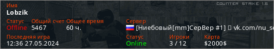 Играет на Counter Strike 1.6 сервере. Страна: РоссияПервый раз замечен 12:08 21.01.2021