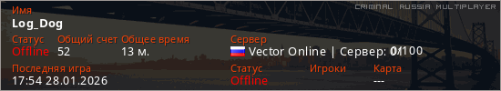 Играет на Criminal Russia Multiplayer сервере. Страна: РоссияПервый раз замечен 20:14 23.01.2026
