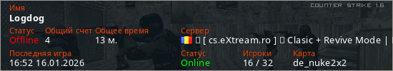 Играет на Counter Strike 1.6 сервере. Страна: РумынияПервый раз замечен 15:17 16.01.2026