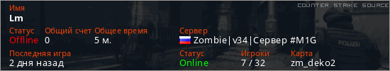 Играет на Counter Strike Source сервере. Страна: РоссияПервый раз замечен 00:04 20.04.2026
