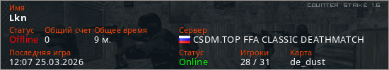 Играет на Counter Strike 1.6 сервере. Страна: РоссияПервый раз замечен 18:53 12.03.2026