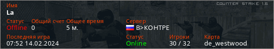 Играет на Counter Strike 1.6 сервере. Страна: РоссияПервый раз замечен 07:50 14.02.2024