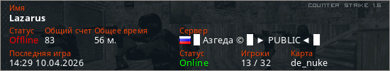 Играет на Counter Strike 1.6 сервере. Страна: РоссияПервый раз замечен 09:34 08.04.2026