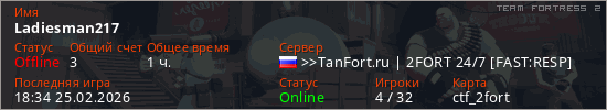 Играет на Team Fortress 2 сервере. Страна: РоссияПервый раз замечен 11:42 07.02.2026