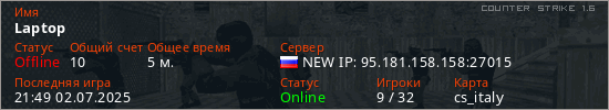 Играет на Counter Strike 1.6 сервере. Страна: РоссияПервый раз замечен 21:44 02.07.2025