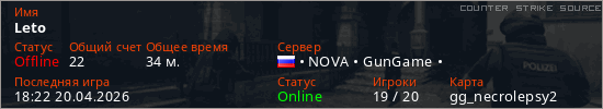 Играет на Counter Strike Source сервере. Страна: РоссияПервый раз замечен 19:55 17.04.2026