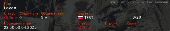 Играет на Call of Duty 4: Modern Warfare сервере. Страна: РоссияПервый раз замечен 23:46 03.04.2025