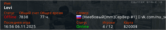 Играет на Counter Strike 1.6 сервере. Страна: РоссияПервый раз замечен 20:07 12.01.2021