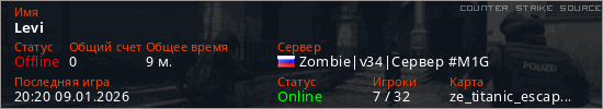 Играет на Counter Strike Source сервере. Страна: РоссияПервый раз замечен 09:36 09.01.2026
