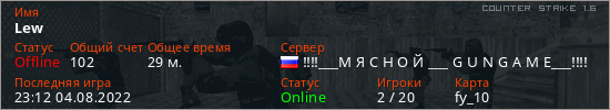 Играет на Counter Strike 1.6 сервере. Страна: РоссияПервый раз замечен 22:45 04.08.2022
