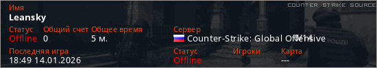Играет на Counter Strike Source сервере. Страна: РоссияПервый раз замечен 18:41 14.01.2026