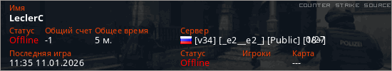 Играет на Counter Strike Source сервере. Страна: РоссияПервый раз замечен 11:33 11.01.2026