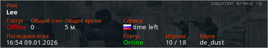Играет на Counter Strike 1.6 сервере. Страна: РоссияПервый раз замечен 16:52 09.01.2026