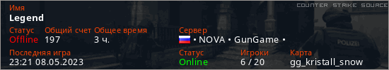 Играет на Counter Strike Source сервере. Страна: РоссияПервый раз замечен 19:16 13.08.2022