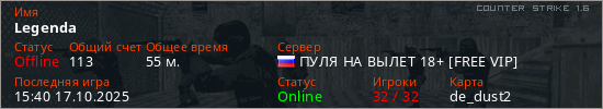 Играет на Counter Strike 1.6 сервере. Страна: РоссияПервый раз замечен 20:31 20.07.2025