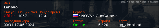 Играет на Counter Strike Source сервере. Страна: РоссияПервый раз замечен 13:05 13.08.2022