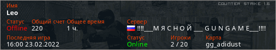 Играет на Counter Strike 1.6 сервере. Страна: РоссияПервый раз замечен 17:46 22.02.2022