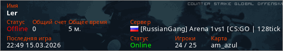 Играет на Counter Strike Global Offensive сервере. Страна: РоссияПервый раз замечен 22:37 15.03.2026