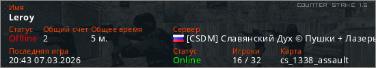 Играет на Counter Strike 1.6 сервере. Страна: РоссияПервый раз замечен 20:36 07.03.2026