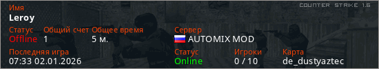 Играет на Counter Strike 1.6 сервере. Страна: РоссияПервый раз замечен 07:28 02.01.2026