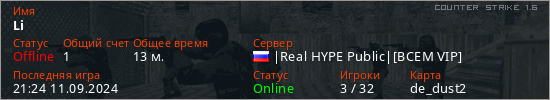 Играет на Counter Strike 1.6 сервере. Страна: РоссияПервый раз замечен 22:10 29.08.2024