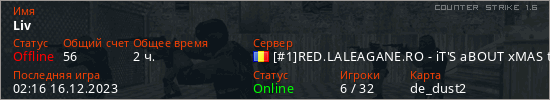 Играет на Counter Strike 1.6 сервере. Страна: РумынияПервый раз замечен 21:44 05.11.2023