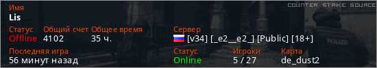 Играет на Counter Strike Source сервере. Страна: РоссияПервый раз замечен 22:38 09.12.2023