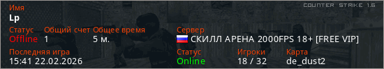 Играет на Counter Strike 1.6 сервере. Страна: РоссияПервый раз замечен 15:39 22.02.2026