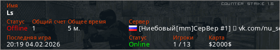 Играет на Counter Strike 1.6 сервере. Страна: РоссияПервый раз замечен 20:17 04.02.2026