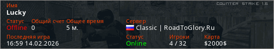 Играет на Counter Strike 1.6 сервере. Страна: РоссияПервый раз замечен 16:54 14.02.2026