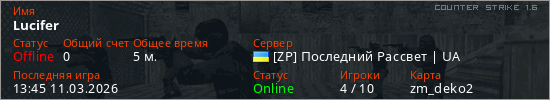 Играет на Counter Strike 1.6 сервере. Страна: УкраинаПервый раз замечен 13:30 11.03.2026