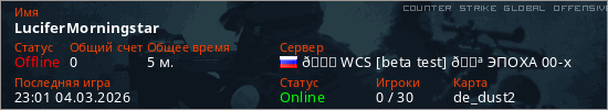 Играет на Counter Strike Global Offensive сервере. Страна: РоссияПервый раз замечен 22:59 04.03.2026