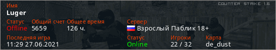Играет на Counter Strike 1.6 сервере. Страна: РоссияПервый раз замечен 08:10 15.02.2020