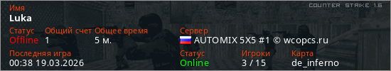 Играет на Counter Strike 1.6 сервере. Страна: РоссияПервый раз замечен 00:00 19.03.2026