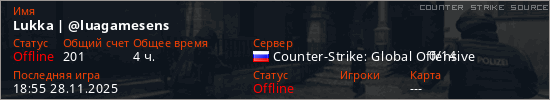 Играет на Counter Strike Source сервере. Страна: РоссияПервый раз замечен 15:41 02.10.2025