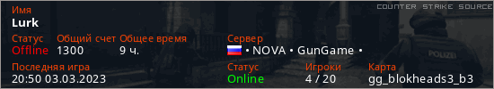Играет на Counter Strike Source сервере. Страна: РоссияПервый раз замечен 23:01 17.02.2023