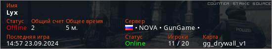 Играет на Counter Strike Source сервере. Страна: РоссияПервый раз замечен 14:55 23.09.2024
