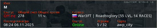 Последний раз был в сети 08:24 06.11.2025 Игрок с таким ником замечен на 46 серверах